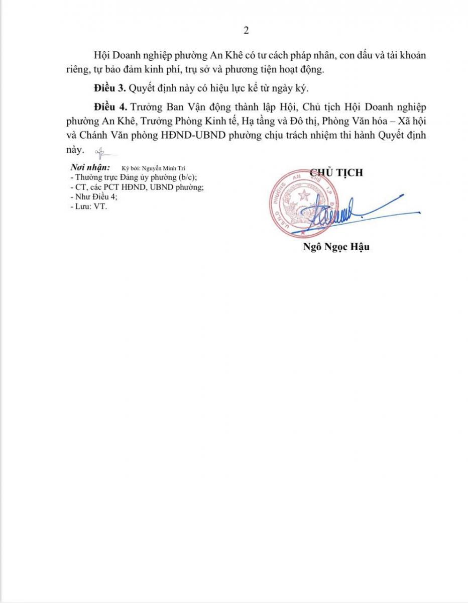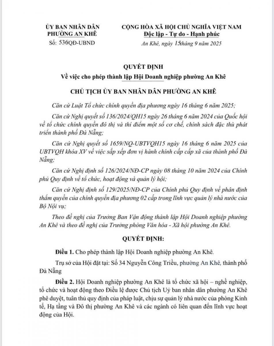 Hội doanh nghiệp Phường An Khê được Chủ tịch UBND Phường cấp quyết định thành lập vào ngày 15/09/2025